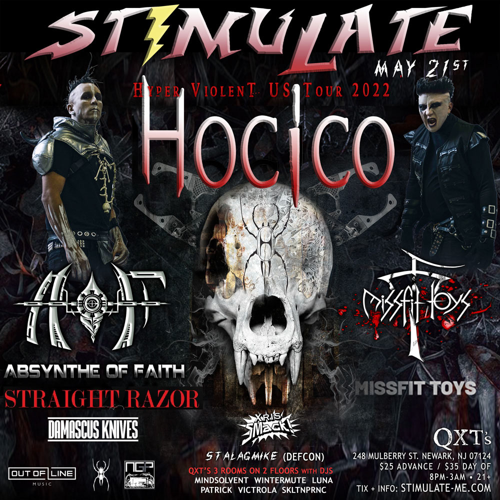 My birthday falls on a club night this year and we’re celebrating in style. Stimulate is coming to QXT’s Nightclub in Newark NJ and they’re bringing with them Hocico, Missfit Toys, Absynthe of Faith, Straight Razor, and Damascus Knives for musical performances as part of the Hyper Violent US Tour 2022.